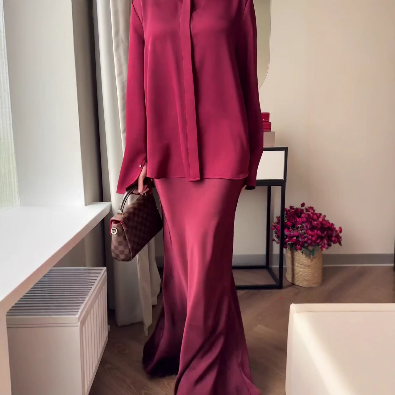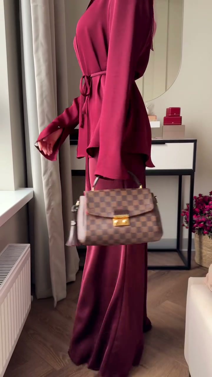 Die Kleidung ist im modischen Modest-Fashion-Stil gehalten, kombiniert mit einem braunen Hijab und einem schmalen Taillengürtel.